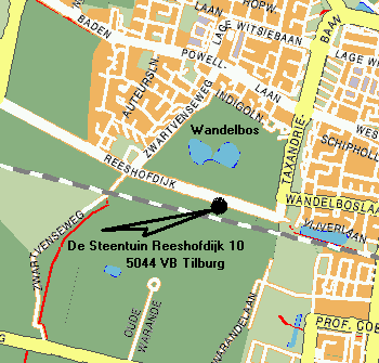 Neem op de A58 afslag 11 Tilburg west - Goirle . Einde afslag links af richting centrum . U komt dan op de Ringbaan west . Deze weg blijft u volgen . U komt verschillende stoplichten en kruisingen tegen. De weg blijven volgen tot u een spoorbrug overgaat. Onderaan de spoorbrug komt u bij stoplichten. U ziet nu aan uw linkerkant een moskee liggen. Bij deze stoplichten gaat u linksaf de wandelboslaan op. Deze weg blijven volgen. U passeert enkele rotondes en stoplichten. U blijft rechtdoor rijden tot u op een soort T spiltsing komt . U rijdt dan tegen het wandelbos. Hier gaat u linksaf de taxandriëbaan op (100m) die dan vanzelf overgaat in het begin van de Reeshofdijk. De steentuin ligt dan ongeveer 300 m aan de linkerkant. !